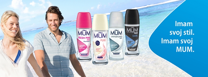 Dezodoranti MUM so v obliki roll-ona v stekleni embalaži in imajo dve prijazni in pomembni lastnosti: s svojo inovativno formulo 100 % zaščitijo pred znojenjem v vseh pogojih, obenem pa so še prijazni do kože. Ker ne vsebujejo parabenov, alkohola, silikona, parafina in triklosana, so primerni tudi za alergike.